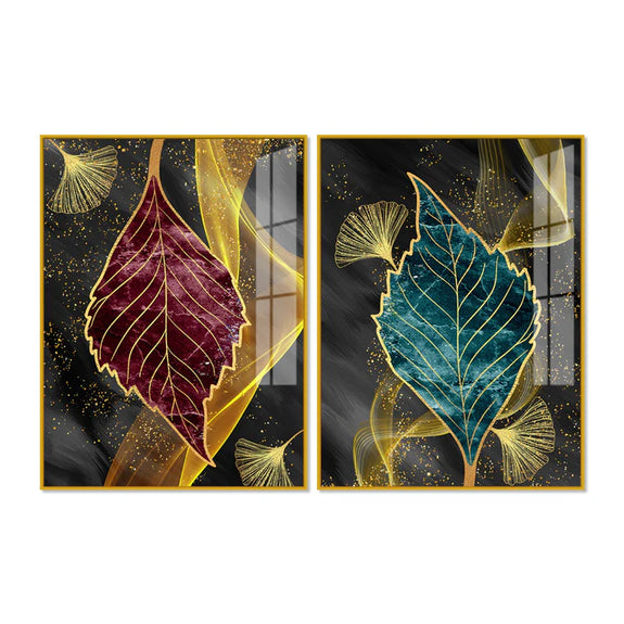 Green and Red Leaf Shape Acrylic Floating Wall Painting Set of 2